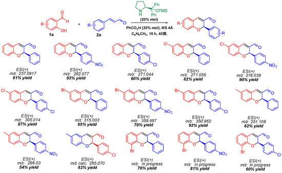 Once the reaction conditions were optimized (entry 4), the scope and limitations of the reaction were explored by synthesizing derivatives with different substitution patterns on salicylaldehyde and cinnamaldehyde. In this sense, whole products were efficiently obtained through the iminium-ion activation mode, confirming the versatility of the proposed strategy (Scheme 1).