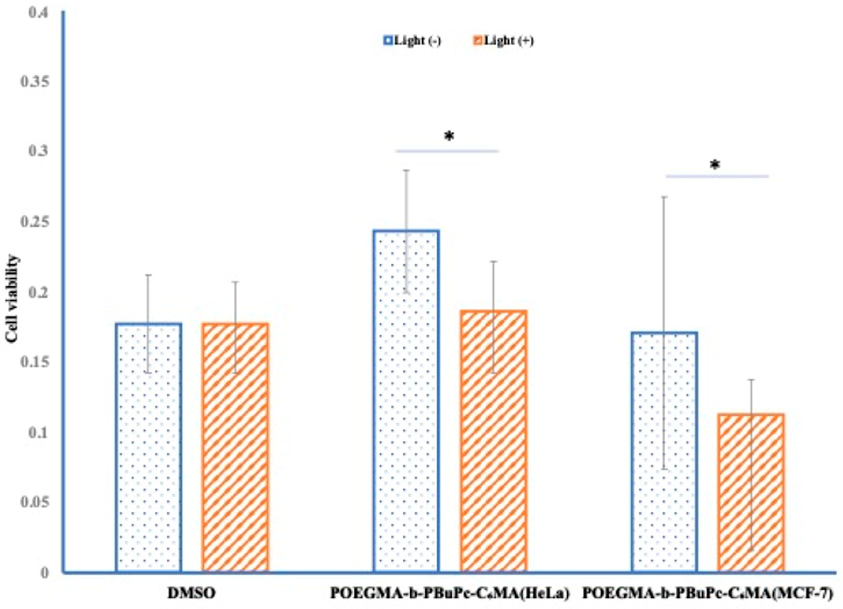 The phototoxicity test was evaluated using HeLa cells and MCF−7 cells. The results showed a significant decrease in survival rate in MCF−7 cells (Figure 3). In this study, photocytotoxicity was confirmed; however, it remains unclear whether this effect results from cellular uptake of the photosensitizer-loaded micelles or from their adhesion to the cell membrane. Further investigation is required to clarify the mechanism of cellular interaction.