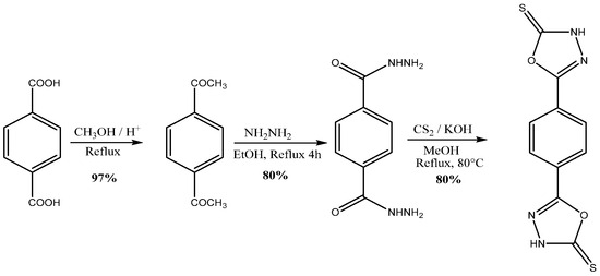 First, terephthalic acid was converted to diester by esterification in methanol in the presence of a catalytic amount of sulfuric acid, yielding an excellent 97% yield [15,16]. The second step consists of preparing the dihydrazide, obtained by reflux heating the diester with an excess (35%) of hydrazine in ethanol with a yield of 80%. Finally, the dihydrazide was subjected to a cyclization reaction in the presence of carbon disulfide and potassium hydroxide under reflux, leading to the production of bioxadiazole in the form of a white solid, with a yield of 80% and a high melting point.