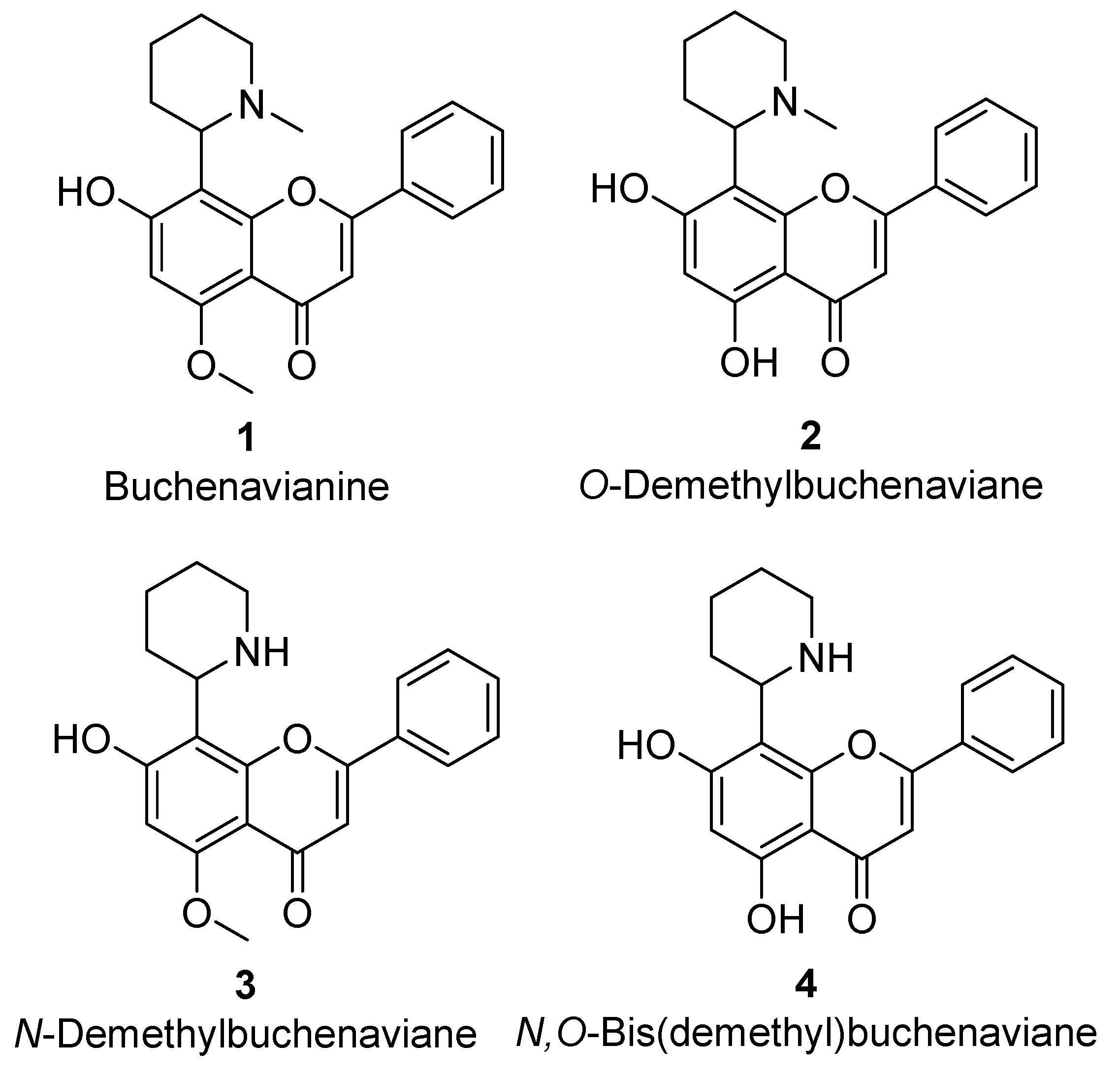 - Beutler, J.A.; Cardellina, J.H., II; McMahon, J.B.; Boyd, M.R.; Cragg, G.M. Anti-HIV and Cytotoxic Alkaloids from Buchenavia capitata. J. Nat. Prod. 1992, 55, 207–213. [Google Scholar] [CrossRef] [PubMed]