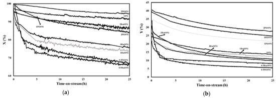 The catalysts, after the stability tests described in Figure 1, were characterized to evaluate the effect of time on the stream on their specific surface areas as well as the extent of carbon deposition. The BET area of the spent catalysts and the relative carbon formation rate (defined in Equation (3)) are listed in Table 2.