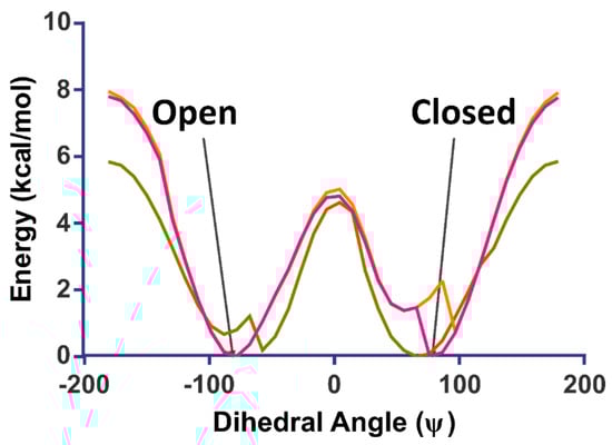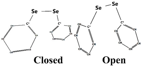 The PES scan performed at ZORA-OPBE-D3(BJ)/ZORA-def2-TZVP level of theory across the dihedral angle ψ (C-Se-Se-C *, Scheme 1) reveals two minima corresponding to approximately −80 and +80 degrees (Figure 1). The spikes in the curve correspond to switches in the orientation of the phenyl rings converting the open/closed conformations (Figure 2). Solvation brings minimal changes, and the two minima are just slightly shifted, while the phenyl rings orientation in correspondence of these minima is maintained as in the gas phase. The actual detoxifying of MeHg+ is the selenol metabolite obtained from the reduction of (PhSe)2 by two electrons transfer process (Scheme 2, Figure 3, breaking the Se-Se bond. The orientation of the phenyl rings is expected to modulate the equilibrium shift, either in favor or against the formation of selenol, hence modifying indirectly the detoxification process. Hydride transfer process are strongly affected by solvent []. The crystallographic structure retrieved from the Cambridge Structural Database (CSD) [,] is in the closed state. At ZORA-CAM-B3LYP/zora-def2-TZVP (Figure 3) the modelled spectrum of the open state, matches to the experimental spectrum at λmax 238.7 nm, with slight difference of only 0.2 nm. The excitation energy of the open state at the same level of theory matches to the experimental band gap energy of 5.2 eV. The cDFT result revealed change in susceptibility of diphenyl diselenide in the closed state for nucleophilic attacks with the dual descriptor f(2)(r) > 0 (0.032) to electrophilic attacks with f(2)(r) = −0.046, with extended bond length of 5%. Change to open state increases the reactivity, with the local softness (S-) on the selenium atoms almost doubled.