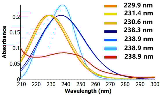 A stock solution of 10 mM was prepared by dissolving 19.6 mg of (PhSe)2 in 6.28 mL of 70% Acetonitrile, from which 5 µL ((PhSe)2 final concentration of 50 µM) was used in the reaction, same concentration applied to NaBH4, DTT and MeHg. The UV absorption spectrum of (PhSe)2 was recorded in the region of 220–450 nm with 70% acetonitrile as the solvent using a UV-1800 Shimadzu spectrophotometer (Shimadzu, Kyoto, Japan). Analysis of methylmercury reaction with (PhSe)2 was performed using a Shimadzu SPD-20A UV/V is Detector (Shimadzu, Kyoto, Japan). CBM-20A communication bus module and DGU-20A5 Degasser prominence high-performance liquid chromatography (HPLC) controlled by the LCSolution software system version 1.22 SP1. Detection was monitored at 239 nm UV wavelength. The separation was achieved on a VerticalTM VertiSep GES C18 HPLC column (4.6 × 150 mm). The mobile phase used for the analysis of the reaction was at 70% acetonitrile–0.5% phosphoric acid aqueous solution (70:30, v/v) with a flow rate of 0.8 mL/min. An injection volume of 50 µL was used. The retention time was approximately 12.5 min for (PhSe)2. The peak areas were used for quantification. The estimated void volume is 1.75 mL and at 0.8 mL/min flow rate gives 2.19 min.