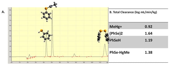 (A). The chromatogram of (PhSe)2 using VerticalTM VertiSep GES C18 HPLC column (4.6 × 150 mm) with 70% acetonitrile, 0.5% phosphoric acid aqueous solution (70:30, v/v) mobile phase at a flow rate of 0.8 mL/min. (B). Total clearance of the reagents as predicted using pKCSM.