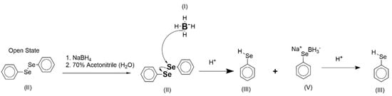 (PhSe)2 presents two conformations in its ground state, referred to as the closed and open conformation (Scheme 1) [,]. The reduction of (PhSe)2 using NaBH4 involves a hydride transfer via a likely single-step mechanism [], Scheme 2. It has been reported [] that the hydride transfer process is strongly affected by solvent, with the open state acting as the hydride acceptor from the NaBH4 donor. A likely mechanism is shown in Scheme 2.