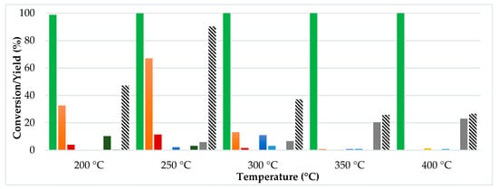 Firstly, the effect of the reaction temperature on the feasibility of the methyl levulinate (ML) reduction to GVL using ethanol as the H-donor was investigated in the gas-phase over ZrO2 (Figure 1). Interestingly, in our reaction conditions (see Figure 1 caption), ML conversion was complete at the lowest temperature, while GVL was formed only between 200 and 300 °C with a maximum yield of 65% at 250 °C. In addition, the carbon balance of the reaction follows a volcano plot with a maximum of 90% at 250 °C. For all these reasons, 250 °C was selected as the best reaction conditions for the following tests.