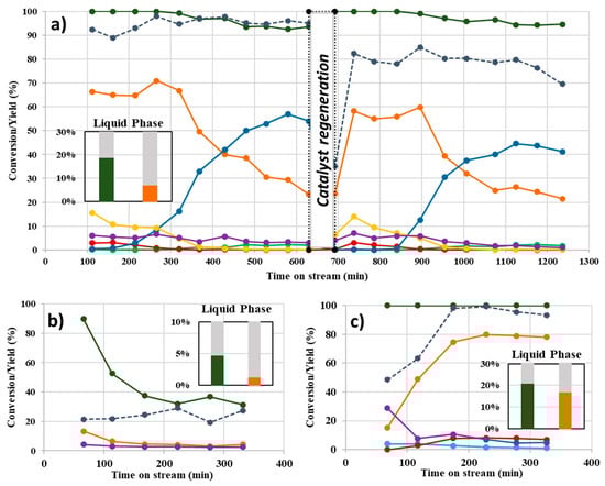 However, in the long-term stability tests performed with ethanol (Figure 2a), the progressive continuous deposition of heavy carbonaceous compounds over the catalytic surface, led to the blockage and poisoning of the active Lewis acid sites, and therefore, led to a progressive decrease in the conversion and change in chemo-selectivity, promoting the alcoholysis of angelica lactones back to EL. Nevertheless, in situ regeneration of the catalyst was successfully achieved, by performing a heat treatment, by feeding air at 400 °C for 2 h and permitted the almost complete recovery of the initial catalytic behavior, proving that the deactivation of ZrO2 is reversible and that regeneration could be achieved in a simple and practical manner.