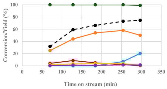 Finally, a real bio-ethanol mixture was used as the H-donor for ML at the previously optimized conditions. Figure 3 shows that bio-ethanol gave a slightly less satisfactory catalytic performance compared to the one obtained with HPLC-grade ethanol. This is probably due to the presence of impurities in bioethanol (i.e., acetic acid and aldehydes) that could foster the formation of heavy carbonaceous compounds on the catalytic surface, promoting the faster deactivation of the catalyst and in this way decreasing the maximum obtainable GVL yield.