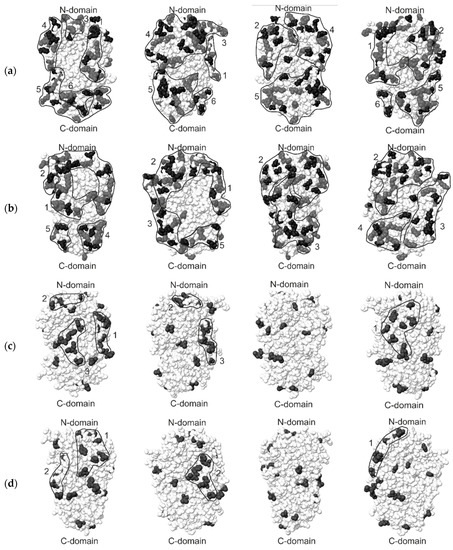 Distribution of amino acids on the surfaces of beta-fructosidases 1UYP and 1W2T (molecules rotated 90 degrees): (a) The distribution of charged amino acid clusters on the surface of beta-fructosidase 1UY; (b) The distribution of charged amino acid clusters on the surface of beta-fructosidase 1W2; (c) The distribution of hydrophobic amino acid clusters on the surface of beta-fructosidase 1W2T; (d) The distribution of hydrophobic amino acid clusters on the surface of beta-fructosidase 1UYP.