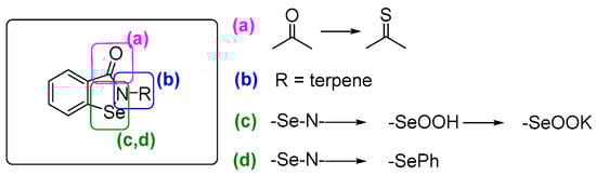 Reactive oxygen species (ROS) play an important role as mediators and regulators in the cells physiology [,]. However, their intense and long-lasting effect can have a destructive impact on biomolecules, such as DNA, lipids, or proteins and consequently cause a whole range of diseases, e.g., cardiovascular disorders, cancer, neurodegeneration, and aging [,,]. Therefore, the production of ROS must be strictly controlled by the enzymatic and non-enzymatic antioxidant systems in order to avoid the disorder of homeostasis between pro- and antioxidant processes, which are defined as “oxidative stress” [,]. The selenoenzyme–glutathione peroxidase (GPx) is an important part of this bio-machinery. Ebselen (N-phenyl-1,2-benzisoselenazol-3(2H)-one) was one of the first organoselenium compounds to be discovered as a GPx mimic. Although ebselen was found to have very promising antioxidant properties, several side effects and low solubility prompted the search for specific structural modifications that could improve its bioavailability and reduce the observed negative after-effects. Until now, we have performed several transformations of the benzisoselenazolone core that enable modifying the bio-activity of the basic ebselen structure. These modifications included (a) exchanging the oxygen atom of a carbonyl group for a sulfur atom to form thiocarbonyl derivatives; (b) substitution of the nitrogen atom with chiral skeletons; (c) oxidation of the Se-N bond to form selenenic acids -SeOOH and its subsequent transformation into the water-soluble seleninic acid potassium salts; and (d) transformation of the Se-N bond into a selenide moiety (Scheme 1).
