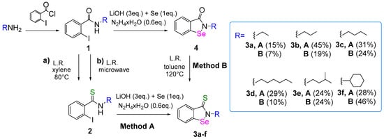 N-alkylbenzisoselenazolthiones 3a–f were obtained by two different two-step methods. The first of them (Method A) involved the reaction of N-alkyl-o-iodobenzamides 1 with Lawesson’s reagent (L.R.), which was followed by the nucleophilic substitution of the obtained thioamides by Li2Se2. The second procedure (Method B) was based on the formation of benzisoselenazol-3-(2H)-ones 4 in the reaction of N-alkyl-o-iodobenzamides 1 with Li2Se2 [] and then the reaction of ebselen derivatives 4 with Lawesson’s reagent (Scheme 2).