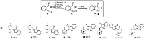 For this purpose, we have first synthetized a series of terpene amines by a multistep methodology starting from the corresponding alcohol (p-menthane system) or alkene (pinene and carene systems), which were further converted to corresponding benzisoselenazol-3(2H)-ones 7–14 by the reaction with 2-(chloroseleno)benzoyl chloride 6 (Scheme 3) [].