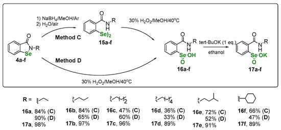 The main way to improve the bioavailability of a chemical compound is to increase its solubility in body fluids. The moderate antioxidant activity of ebselen is mainly related to its poor solubility in water, which becomes particularly important when attempting to administer the drug intravenously. To address this issue, we have conducted the synthesis of water-soluble derivatives in the form of potassium salts of 2-(N-alkylcarboxamido)benzeneselenic acids 17a–f. The first step of the research involved the synthesis of N-alkylbenzeneseleneinic acids 16a–f with o-amide function. The acids 16a–f were obtained using two alternative methods: by oxidation of N-alkylbenzisoselenazol-3(2H)-ones 4a–f (Method C) or the corresponding diselenides 15a–f (Method D) with 30% H2O2. N-alkylbenzeneseleninic acids 16a–f in the next step were converted into the corresponding benzeneseleninic salts 17a–f by reaction with potassium tert-butoxide in anhydrous ethanol (Scheme 4) [].