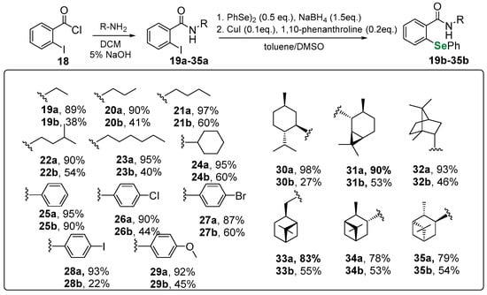 The first step of the research involved the synthesis of N-substituted o-iodobenzamides 19a–35a by the reaction of amines with o-iodobenzoic acid chloride 18. The resulting benzamides 19a–35a were converted into the corresponding N-aliphatic, N-aromatic, and chiral N-terpene phenylselenides 19b–35b using a newly developed procedure involving nucleophilic copper-catalyzed substitution by Se-nucleophile generated in situ from diphenyl diselenide and sodium borohydride (Scheme 5) [].