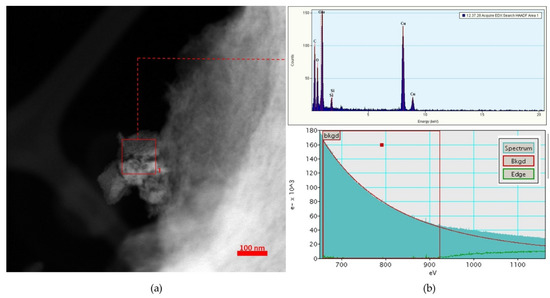 (a) TEM image of CuNPs/MK10 catalyst. (b) Top: EDX profile from red square. Bottom: Background subtraction in EELS confirming the presence of copper.