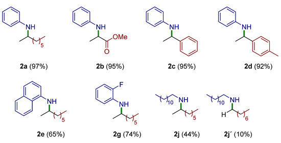In general, imines can be hydrolyzed in acidic media, making purification not possible by chromatographic methods using common stationary phases (silica gel or alumina). However, imines from HA reaction can be reduced to the corresponding amines with a simple method in the presence of sodium cyanoborohydride, as described in the experimental section, giving the corresponding amines, which are also of great interest for multiple applications (Scheme 3). For this purpose, some selected examples were tested by reducing the corresponding imines by treatment with NaBH3CN in the presence of p-toluenesulphonic acid, maintaining an acidic pH for about 2–4 h. The amines shown in Figure 4, obtained by reduction of the corresponding imines, were then purified by column chromatography, giving in all cases very good quantitative yields.
