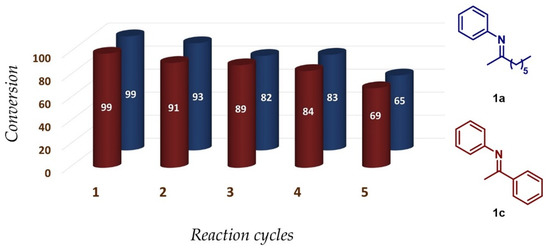 In order to check the recyclability of the catalyst, two model reactions were chosen. On one side, HA reaction was carried out under the optimized conditions by using aniline and 1-octyne as reagents and by using aniline and phenylacetylene on the other side (Figure 5). After each cycle of reaction, an aliquot was analyzed by GC-MS, and the catalyst was recovered by centrifugation and washed several times with toluene, THF, and EtOH, as described in the experimental section. Then, the recovered solid was dried and weighted and used in another reaction cycle without any additional treatment. Similar behavior was observed in both model reactions tested, proving that the catalyst was reusable regardless of the starting reagents. Conversion of aniline to imine 1a (Figure 5, blue) and 1c (Figure 5, dark-red) showed very good activity of the catalyst, at least after four cycles. The regioselectivity of the reaction was also maintained optimally, giving in all cases the Markovnikov adduct, with no presence of the anti-Markovnikov product.