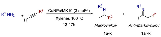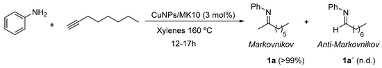 For the optimization of reaction conditions, aniline and 1-octyne were chosen as model starting reagents, using toluene as the solvent and heating at 110 °C. Then, it was necessary to use a mixture of xylenes as solvent in order to increase the temperature up to 160 °C. The best results under these conditions were obtained by using CuNPs/MK10 as the catalyst, showing a quantitative conversion of the starting aniline, with a 3 mol% catalyst loading (Scheme 1). Moreover, the reaction was completely regioselective toward the Markovnikov HA product. Although the presence of the Markovnikov and the anti-Markovnikov products can be estimated by GC-MS, it is important to precisely determine the ratio between these products in order to evaluate the regioselectivity of the process. For this purpose, imines obtained by HA can be hydrolyzed with dilute hydrochloric acid, giving a ketone as one of the products in the case of Markovnikov addition and an aldehyde in the case of the anti-Markovnikov product. Both the ketone and the aldehyde can be then determined by GC-MS more accurately than the corresponding imines.