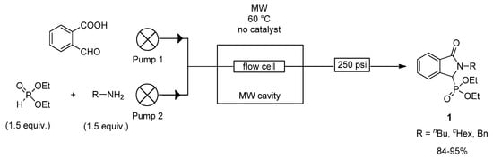 In order to further increase the productivity, the reaction of 2-formylbenzoic acid, butyl-, cyclohexyl-, or benzyl amine and diethyl phosphite was transferred into a con-tinuous flow MW reactor (Figure 2). The continuous flow system applied consisted of a dual HPLC pump, a CEM® MW reactor equipped with a commercially available CEM® continuous flow cell, a cooler and a back-pressure regulator operating at 17 bar. During the continuous flow reactions, ethanol was used as the solvent. Complete conversions were reached using 1.5 equivalents of the amines and of the phosphorus reagent at 60 °C for residence times of 30–45 min. The flow approach allowed the scaled-up synthesis of the target compounds in productivities of 0.6–1.8 g/h.