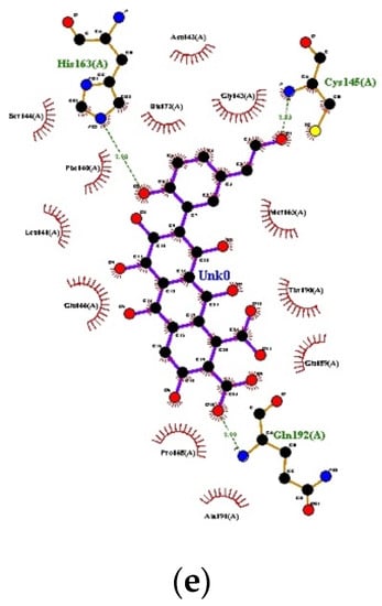 Docking interactions: (a) Orange B, (b) Cochineal Red A, (c) Erythrosine, (d) Laccaic acid A, (e) Laccaic acid B.