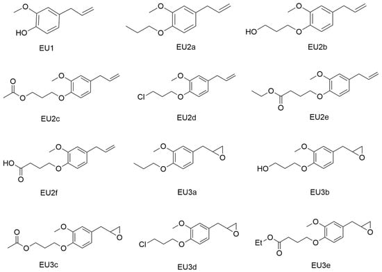 Eugenol and eleven derivatives (Figure 1 EU1–EU3e) were selected as new potential insecticides. These molecules have been previously synthesized and validated experimentally with good insecticidal activity.