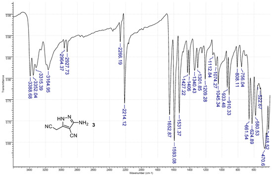 The FT–IR (ATR mode) spectrum of 3-amino-5-(cyanomethyl)-1H-pyrazole-4-carbonitrile 3.