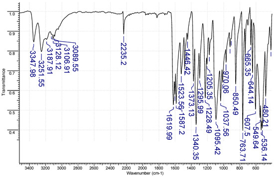 The FT-IR (ATR mode) spectrum of 2-amino-3-cyanoquinoxaline 1,4-dioxide 6.