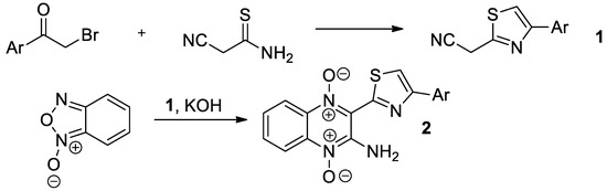 First, we reacted benzofuroxane with 2-cyanomethylthiazoles [12], easily available by the Hantzsch reaction of cyanothioacetamide [13,14] with phenacyl bromides (Scheme 1). Hybrid polyheterocycles 2, bearing both thiazole and quinoxaline fragments, were recognized as the reaction products.