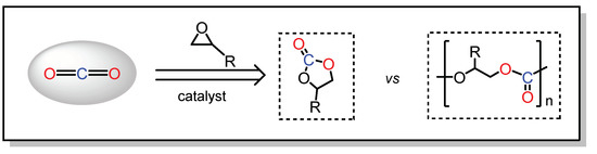 Due to its high abundance and reduced toxicity, an increasing number of applications of carbon dioxide as a reagent have been recently developed to produce added value chemicals, namely in the synthesis of carboxylic acids derivatives, carbamates, formamides, organic carbonates, cyclic carbonates and polycarbonates [7,8,9]. Among them, CO2 addition to epoxides (Scheme 1) is particularly relevant since the resulting possible products, cyclic carbonates and polycarbonates, have numerous applications as “green” organic solvents and in the industry of plastics, respectively [10,11,12].