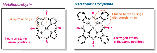 General structure of a metalloporphyrin and a metallophthalocyanine.