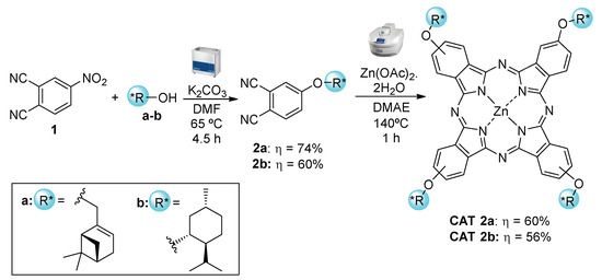 The first step consisted of the ipso-nitro substitution reaction between 4-nitrophthalonitrile and the intended alcohol, using ultrasound irradiation as heating source, with a complete reaction being observed after 4.5 h, with derivatives of phthalonitriles being obtained of (1R)-(−)-myrtenol and (1R,2S,5R)-(−)-menthol with yields of 74% and 60%, respectively. Next, we proceeded with the second step in the synthesis of the metallophthalocyanine type catalysts, which consisted in the condensation of the synthesized phthalonitriles with the desired metal salt. Thus, the cyclotetramerization reactions of phthalonitrile precursors derived from monoterpenes 2a and 2b, were carried out, using the metal salt Zn(OAc)2 as a template and N,N-dimethylaminoethanol (DMAE) as solvent, using microwave irradiation as heating source. After 1 h of reaction, it was possible to observe the total consumption of the starting material, with yields of 60% for CAT 2a and 56% for CAT 2b, after purification by flash chromatography.