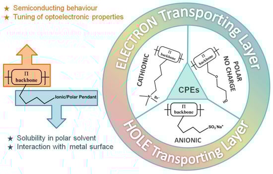 The conjugated polyelectrolytes (CPEs) have proved to be particularly effective in solid-state optoelectronic applications. In fact, as solution-processed materials with respect to the evaporated counterpart, they are ideal for low-cost, large-scale technologies such as roll-to-roll or ink-jet printing; their orthogonal solubility simplifies the preparation procedures of the devices, preventing re-dissolution of the hydrophobic semiconducting layer during device fabrication; they are compatible with flexible devices; they are environmental friendly thanks to water solubility; they have unique solid-state interface properties, which increase the adhesion between organic and metallic layers; and they have the ability to reduce the barrier between electrode and active layers thanks to the formation of an aligned interfacial dipole at the metal/organic semiconductor interface.