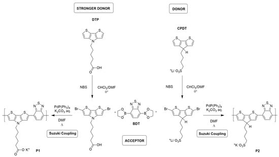 Herein, we present the synthesis and preliminary optoelectronic characterization of two new low bandgap D-A anionic CPEs as a possible anternative to PEDOT:PSS. We copolymerized the BT monomer with a dithienopyrrolo (DTP) unit that has been reported to be a stronger donor with respect to CPDT moiety. DTP has never been used, to our knowledge, in CPE, and for comparison, we synthetized a CPDT–BT polymer with only a lateral substituent. The DTP–BT polymer has a carboxylate lateral group with a lower acidity than the sulfonate group but with a stronger donor [] in the backbone (polymer P1, Figure 2), and the CPDT–BT polymer is similar to the CPE proposed by Bazan et al., but bearing only one sulfonate group. We aimed to understand the combined role of the backbone, in particular the energy bandgap modulation, as well as the lateral polar groups in the self-doping process of these materials