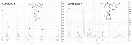 Chemical characterization. The syntheses of compounds 1 and 2 are shown in Figure 2 and confirmed by 1H NMR spectra (Figure 3). In particular, the monosubstitution of monomer 2 was confirmed by the presence of a triplet at 3.74, attributable to H in 4 position in cylopenta-[2,1-b:3,4-b’]dithiophene [].