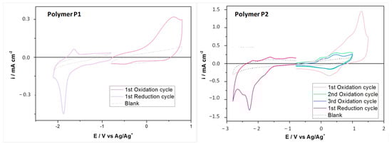 Polymer P2 showed an interesting behavior—the first oxidation peak was at high potential, while the second and third, perfectly reproducible, were at lower potential. Most probably this behavior indicated the formation of solid-state aggregates that disaggregate after the first potential application [].