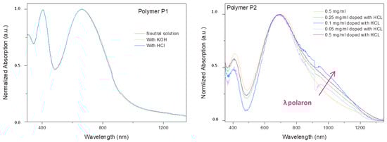 As can be observed in Figure 5, the absorption spectrum of polymer P1 seemed to be unaffected by the addition of an acid or base to change the pH, pointing out that the polymer cannot be doped in acidic conditions. On the other hand, polymer P2 showed the uprising of a polaron band in the near-infrared region with the increasing of the acidity of the solution, confirming the self-doping behavior of the material [].