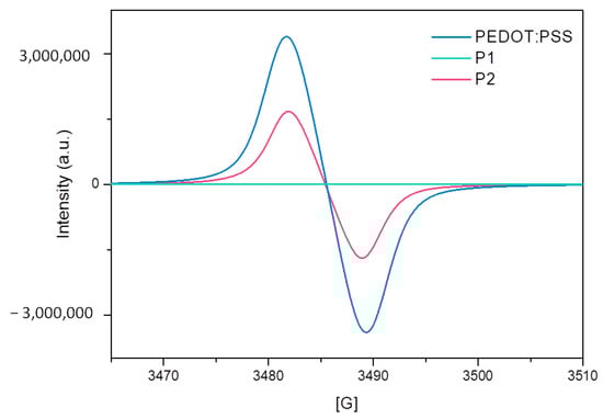 Electron paramagnetic resonance (EPR) spectra of poly(3,4-ethylenedioxythiophene):poly(styrenesulfonate) (PEDOT:PSS), P1 and P2.