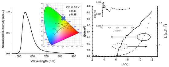 The performance of the device is presented in the right panel of Figure 7. The J(U) and L(U) curves had forms typically observed for diodes. The device switched on at 6 V and the maximal recorded luminance approached 40 cd/m2. Current density values were quite high and in combination with modest luminance led to a weak external quantum efficiency (EQE), shown in the inset of the right panel of Figure 7. It should be underlined that performance was achieved for the device without any optimization.