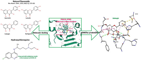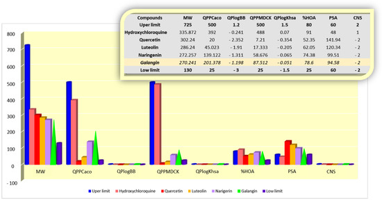 For calculation of the pharmacokinetic properties of the compounds under study with SARS-CoV-2 (quercetin, luteolin, naringenin, galangin, and hydroxychloroquine), we applied the QikProp tool, Schrodinger [19], and selecting the following special features: cell permeability (QPPCaco and QPPMDCK), binding to serum albumin (QPlogKhsa), permeability to the CNS (QPlogBB, CNS and PSA), and oral absorption (% HOA). The drug that is considered an effective candidate for COVID-9 treatment must fulfill the requirements (i) of not crossing the CNS barriers, (ii) high cellular distribution and oral absorption, and (iii) low binding to plasma protein.