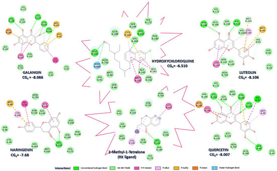 The natural flavonoid antioxidants quercetin, luteolin, naringenin and, galangin, which are usually found in various medicinal and dietary sources, comprise numerous pharmacophoric characteristics that are relevant for their application as drug-like candidates. Alignment of these antioxidant compounds over the native P6N ligand (2-Methyl-1-tetralone) and hydroxychloroquine showed significant overlaps and similarities in binding orientations and interactions (Figure 2). Therefore, such similarities have made it clear that these four natural antioxidants can act as potential inhibitors of Mpro.