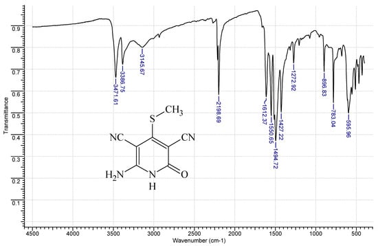 IR spectrum (ν, cm−1): 3471 (NH); 2198 (2 CN); 1612 (C=C, C=N) (Figure 1).