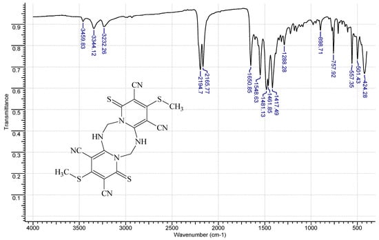 A 50 mL beaker was charged with 0.3 g (0.0013 mol) of 4-(methylthio)-6-amino-2-thioxo-1,2-dihydropyridine-3,5-dicarbonitrile (2, R = CH3, X = S) and 30 mL of DMF. The solution was heated to reflux and then triethylamine (0.3 mL, 0.002 mol) was added. After the starting pyridine 2 dissolved completely, 0.53 mL (0.025 mol) of aq. HCHO (33%, d 1.1 g/mL) was added and the mixture was heated while stirring for another 2 h. Finally, the solution was poured into water and the precipitated solid was filtered off to give 3,10-bis(methylthio)-1,8-dithioxo-5,6,12,13-tetrahydro-1H,8H-dipyrido[1,2-a;1′,2′-e][1,3,5,7]tetrazocine-2,4,9,11-tetracarbonitrile. The yield was 300 mg (55%), m.p. > 250 °C. IR spectrum (ν, cm−1): 3459, 3344, 3232 (NH); 2195, 2166 (4 CN); 1651 (C=C, C=N); 1288, 1417 (C=S) (Figure 2).