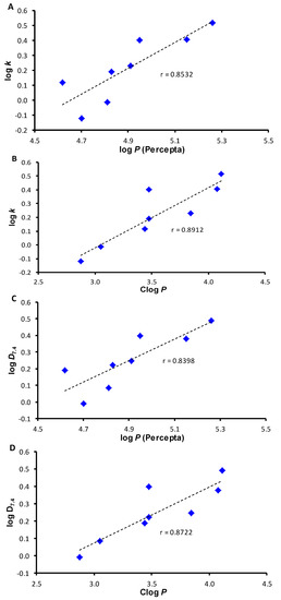 Comparison of experimentally found log k values with predicted log P (ACD/Percepta, (A) and Clog P (ChemBioDraw, (B) and log D7.4 values with predicted log P (ACD/Percepta, (C) and Clog P (ChemBioDraw, (D) of ring-substituted benzyl carbamates of 4-aminosalicylanilides 1–8.
