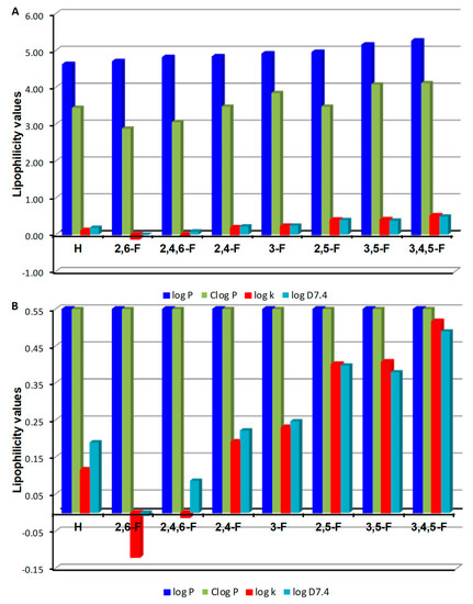 Although the correlation coefficient of both experimental values is high, a discrepancy for compound 6 (R = 3,5-F) can be found. While log k of compound 6 is 0.4072, and it is found between those of compound 4 (R = 2,5-F, log k = 0.4012) and compound 8 (R = 3,4,5-F, log k = 0.5169), the order of log D7.4 values is reversed for compounds 6 (log D7.4 = 0.3788) and 4 (log D7.4 = 0.3974).