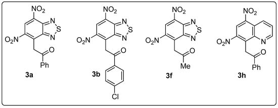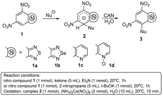 Among numerous highly electrophilic nitro (het)arenes, the following were selected for this study: 4,6-dinitrobenzothiadiazole 1a [7], 4,6-dinitrobenzoselenadiazole 1b [8], 5,7-dinitroquinoline 1c [9] and 5,7-dinitroquinoline-N-oxide 1d [9]. It was found that their reactions with mono- and diketones as well as 2-nitropropane in the presence of a base provided the previously unknown stable anionic adducts 2 in high yields (Figure 1, Table 1). These adducts were isolated in pure form and are characterized by (nuclear magnetic resonance spectroscopy (NMR) and high-resolution mass spectrometry (HRMS). Oxidation of compounds 2 with ammonium cerium (IV) nitrate was studied. In some cases (Table 1, entries 1, 2, 6, 8) the corresponding substitution products 3 were isolated formally representing C-H-functionalized benzoheterocycles. In case of adduct 2c, decomposition was observed, while in case of dinitroquinoline complex 2i, the starting compound 1c appeared to be the sole isolable product. In all other cases, 1NMR spectra showed a 1:1 mixture of the target substitution product and the corresponding starting material (Table 1, entries 4, 5, 7, 10, 11).
