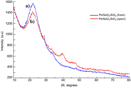 XRD pattern of: (a) fresh Pd/SeO2/SiO2 catalyst; (b) spent Pd/SeO2/SiO2 catalysts.