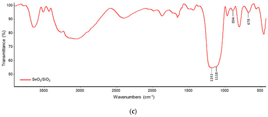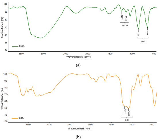 FTIR spectra that correspond to SeO2, SiO2 and SeO2/SiO2 are shown in Figure 3. For SeO2 (Figure 3a), the bands at 871 and 668 cm−1 are due to Se-O stretching, while those at 1248 and 1150 cm−1 are due Se-OH [14].