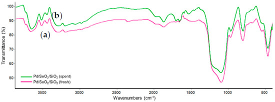 FTIR spectra of: (a) fresh Pd/SeO2/SiO2; (b) spent Pd/SeO2/SiO2.
