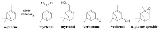 In the present work, the allylic oxidation of α-pinene is studied, since this monoterpene is one of the most abundant in natural sources, and it is easily obtained from the essential oils of coniferous trees (pines), rosemary, lavender, and turpentine [7,8].