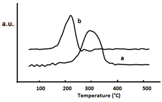 An analysis of the reducibility of the catalysts was carried out in order to throw some light on the promotional effect of Pd on selenium dioxide. The TPR results (Figure 7) indicate that palladium strongly modifies the SeO2 redox character. A change in the reduction pattern of supported selenium dioxide upon the noble metal introduction can be observed. In the profile corresponding to SeO2/SiO2 (Figure 7a) a consumption peak centered at 290 °C is detected, which would be due to the reduction of selenium dioxide. In the binary Pd/SeO2/SiO2 catalyst, the reduction temperature is notably lower (Figure 7b), showing a reduction peak with a maximum at 270 °C. In this sense, it is proposed that the palladium promotional effect on selenium dioxide originates from a high interaction, which modifies the selenium dioxide reducibility. Taking into account that the catalytic results that indicate that the oxidation only yields myrtenal and myrtenol, it is concluded that palladium just plays a promotional role, without a direct participation in the activation of α-pinene. On the other hand, if palladium would act as the active phase, verbenone and verbenol should be produced, as usually observed over noble metal-based catalysts.